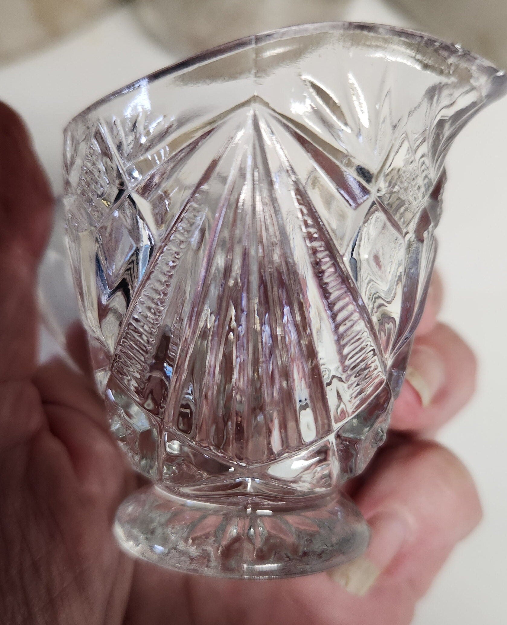 Step back in time with this charming Antique Early American Patterned Glass Child/Toy Sized Creamer and Sugar Bowl set. Manufactured by Co-operative Flint Glass Co. LTD, this set features the iconic REX (OMN) Pattern, which was introduced in 1908. Despite its age, this set still holds its allure, showcasing the craftsmanship of a bygone era. The creamer has a rough lip that seems to have a hairline crack, while the base of the sugar bowl has a chip that is cleverly concealed by the intricate glass cut. Although the sugar bowl is missing its lid, you can envision the beautiful nesting detail it once had, evident by the lip inside the scallops. The scalloped edges of the bowl may feel rough, but this is a result of its unique cut. The set measures approximately 2 1/4" tall, perfect for display or for the enjoyment of young collectors. Despite some minor imperfections, this set is in relatively good condition, reflecting its endurance over time. Co-operative Flint Glass Co., originally known as Beaver Falls Co-operative Flint Glass Co., operated from 1869 until 1937 when it closed due to economic circumstances. Own a piece of history with this exquisite Antique Child/Toy Sized Creamer and Sugar Bowl set. Order now and add a touch of nostalgia to your collection.